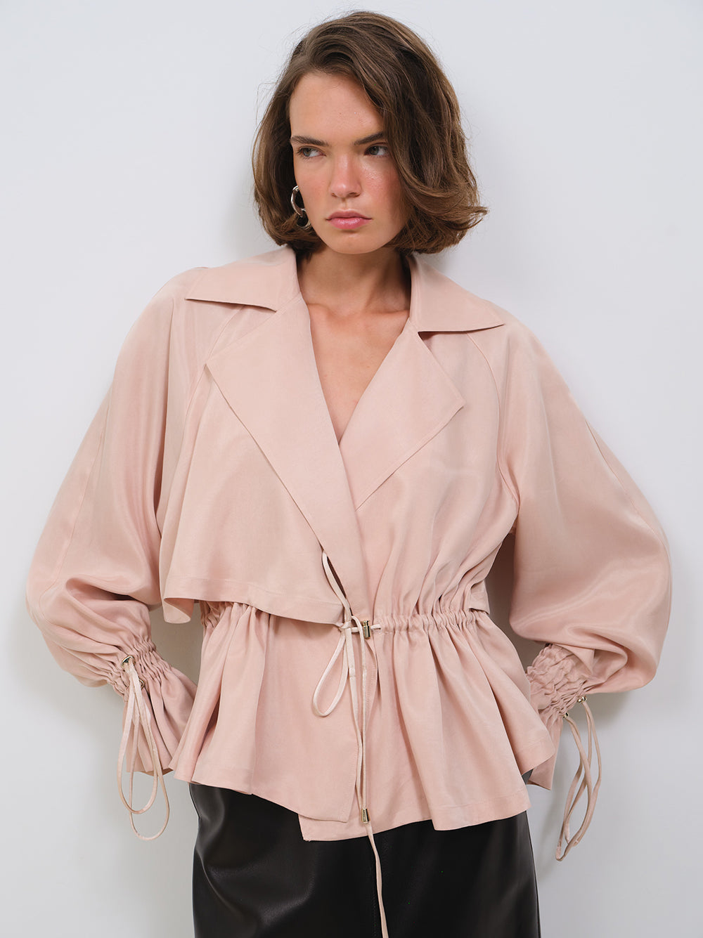 CUPRO SHORT TRENCH COAT WITH DRAWSTRINGS